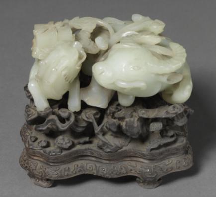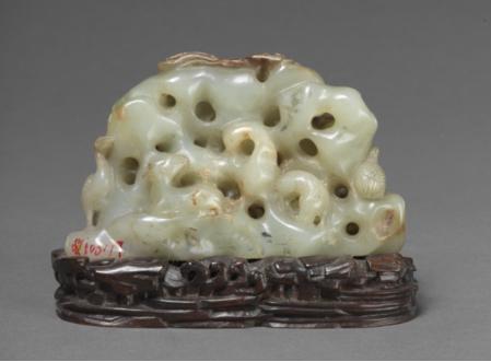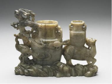 青玉,油灰色。岩石底座上刻着两双耳瓶。在大尊中,小瓶子由一只独角兽承担,站在另一边,雕刻着凤鸟,靠在松树下。林和凤看着它们。