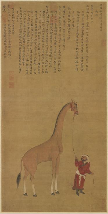 此画描绘 1414 明朝儒林郎翰林院修写沈度于永乐12年作序,宫廷画家绘制,并将这一顺序抄写在画中。原画上部有《瑞应麒麟颂序》,从左边缘到右边缘,共24行。而且还有两个印章,紧贴左边边缘的中心。