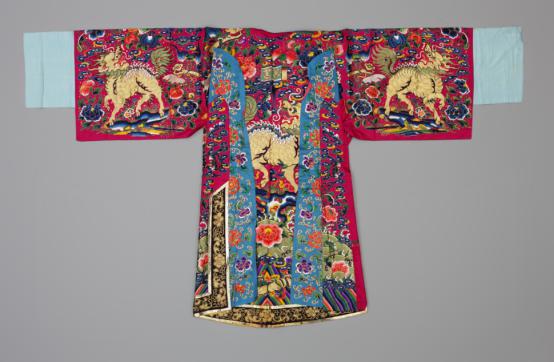 清 紫色缎绣彩云蝙蝠折枝花金麒麟纹男蟒 藏在故宫博物院