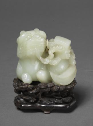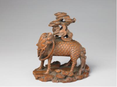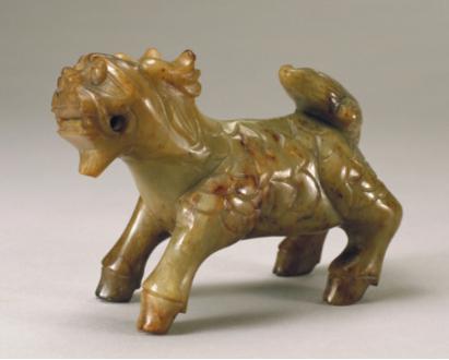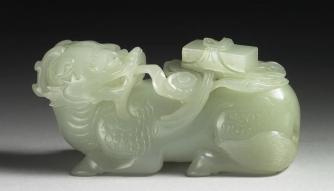 玉石。独角兽跪着,口衔灵芝,身上有鱼鳞纹,背着书卷,姿态生动。这种装置是“独角兽负书”的母题。