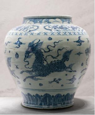 麒麟图案大多用于盘子、瓶子和罐子的外观。明朝中期,麒麟多为卧姿,即前后双腿跪在地上。明末至清初,麒麟多为坐姿,前腿伸直而不是跪着,后脚保持跪着。进入清代康熙后,麒麟的前后腿都站了起来,虎视眈眈,非常有神。
