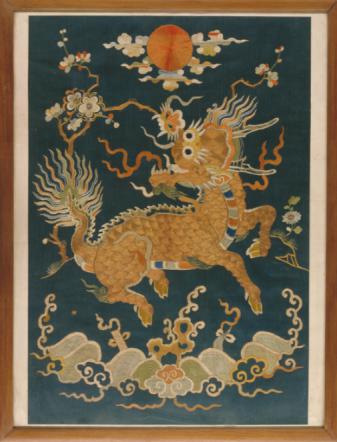 清 蓝缎金线绣麒麟图挂屏幕 藏在故宫博物院