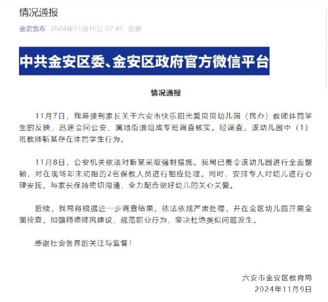 11 月 7 当天,六安市金安区教育局收到父母关于六安市快乐阳光爱贝贝幼儿园(私立)教师体罚学生的报告,迅速将与公安、当地街道组成专班。经调查,该幼儿园(1)班教师靳某对学生进行了体罚。