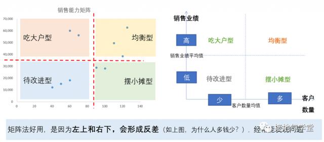 当然,也可以使用 2 一个指标,比如经典的矩阵分析法,通过两个指标交叉。 两个指标平均,分为四类业务,从而得出优劣判断。