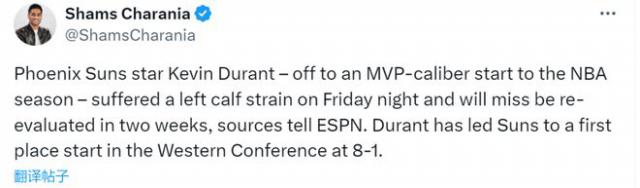 太阳暴跌!杜兰特至少缺阵两周,因为他的左小腿拉伤。 西部第一难保?