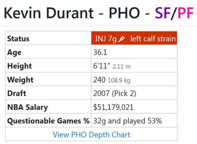 然而,随着杜兰特的受伤,太阳的力量受到了很大的影响,他们很难保持西部第一的排名。伤病网站预测杜兰特至少应该休战。 7 场上下。