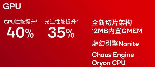 高通提供的数据,以及前代 Adreno GPU 与这次推出的新产品相比 GPU 性能提升 能效提高40% 提高光跟踪性能40%。 35%(归功于升级后的升级。 Snapdragon Elite Gaming 技术)。