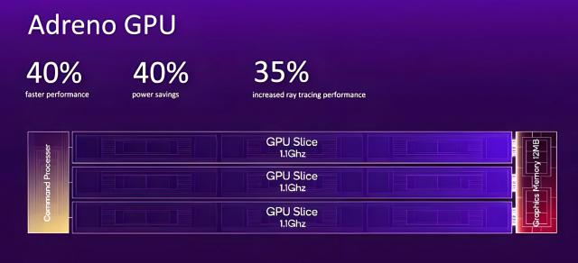 骁龙 8 全新的至尊版 Adreno GPU 第一次使用切片(slice)结构-将着色器的核心和其它固定功能块分成不同的切片:共分为三组,每组频率为 1.1GHz(上代为 三组接受Cpu指令的900MHz(Cammand Processor)统一调度。
