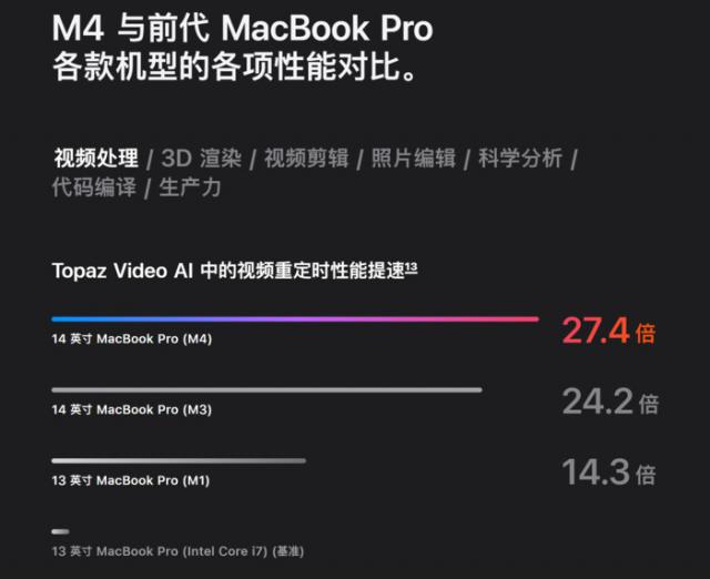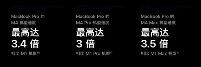 官方的苹果宣传 M4 新产品芯片比例 M1 提高商品效率最高 3.4 倍数。这个意思是 M4 芯片 MacBook Pro 无论是多任务办公、视频剪辑还是操作复杂的软件,都能同时处理更多的任务,更加流畅高效。