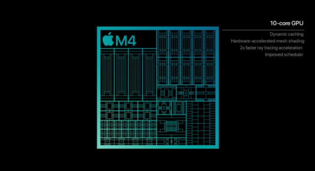 就图形核心而言,M4 芯片延续了 M3 芯片 10 核心设计。尽管核心数量保持一致,但这并不意味着 M4 没有提高图像处理能力。