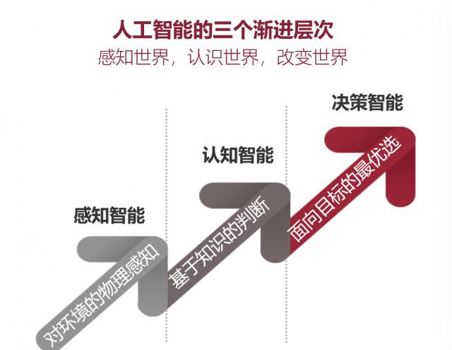 三是智能决策。AI 根据认知分析和推理结果,系统能够高效灵活地结合环境和语境信息,对概率进行全面评估,并根据特定目标做出最佳决策。AI 有助于我们的决策更优化,风险最低。第三阶段是人工智能。