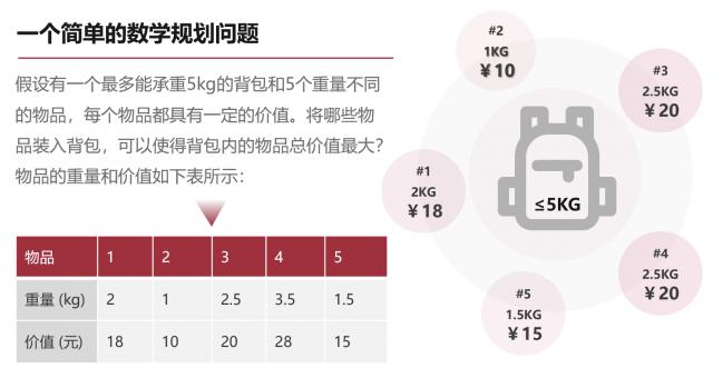 怎样才能做出智能的决定?一般来说,建立一个数据模型,比如这五个项目,我会分别定制一个变量,这个变量是否应该取。 0,要不取 1。取 0 只是不要放在背包里,取出来。 1 就是把它放在背包里。我们想要什么?为了最大化总额,目标函数通常是最大的。但是必须符合一些约束,这些约束是什么?假如决定把什么放在背包里,里面的重量不能超过 5 KG,所有的答案都给你,这是一个数学模型。所有的孩子都在中学或小学,现在都有数学模型的项目或比赛。
