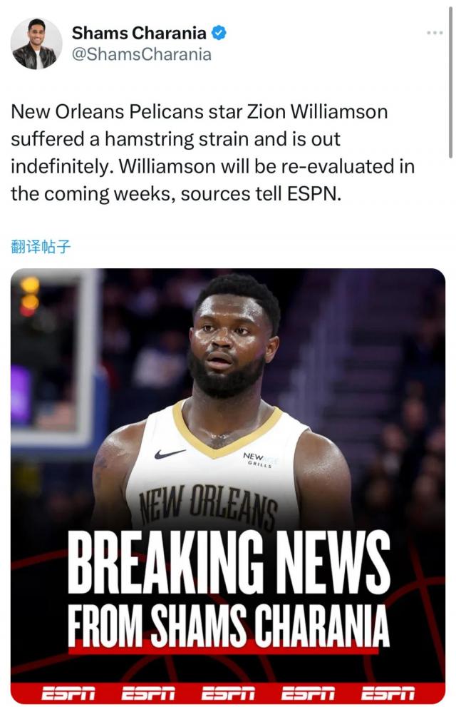 北京时间 11 月 10 日,根据 NBA 着名记者 Shams 报道称,鹈鹕队当家锡安腿筋拉伤,将无限期缺席,在接下来的几周里再次受到评估。没想到的是,锡安又一次倒在了伤病上,鹈鹕的风水也不太好,已经受伤了。 4 一个主力,加上锡安真是雪上加霜。虽然锡安个人能力很强,但他是玻璃人的属性也一直伴随着他,个人出勤率相对较低。