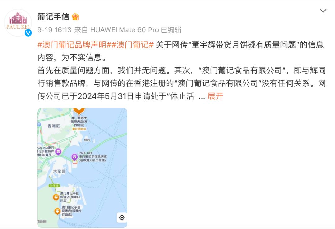 比如9月19日,微博账号“葡萄牙手信”发表声明称,与辉同行直播间销售的澳门葡萄牙月饼,其企业产品无问题,强调企业在中国澳门有真实有效的商标注册,并与珠海厂商有授权委托合同。