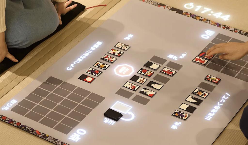 因此,任天堂在天花板上安装了具有图像识别能力的摄像头和投影仪。当玩家坐在下面打纸牌时,上面的摄像头会实时分析布局,并通过 AR 投射,引导玩家学习花札的规则和玩法。