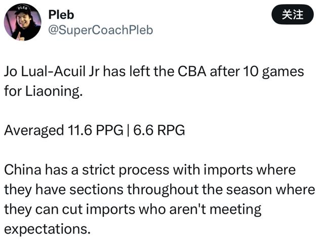 日前,关于辽宁外援的动态一直备受关注。对阿丘尔而言,澳大利亚 NBL 记者 Pleb 写道:阿丘尔正在为辽宁队打球。 10 比赛结束后离开 CBA。这种说法非常清楚,阿丘尔已经正式离开。 CBA 了。现在他肯定不知道阿丘尔是否会回到现在。 NBL。就第一阶段的表现而言,他并非辽宁所需,篮下太软了。就在这个时候,辽宁是否有候选人还不清楚。假如阿丘尔离开,内线没有其他球员顶住,韩德君将会筋疲力尽。