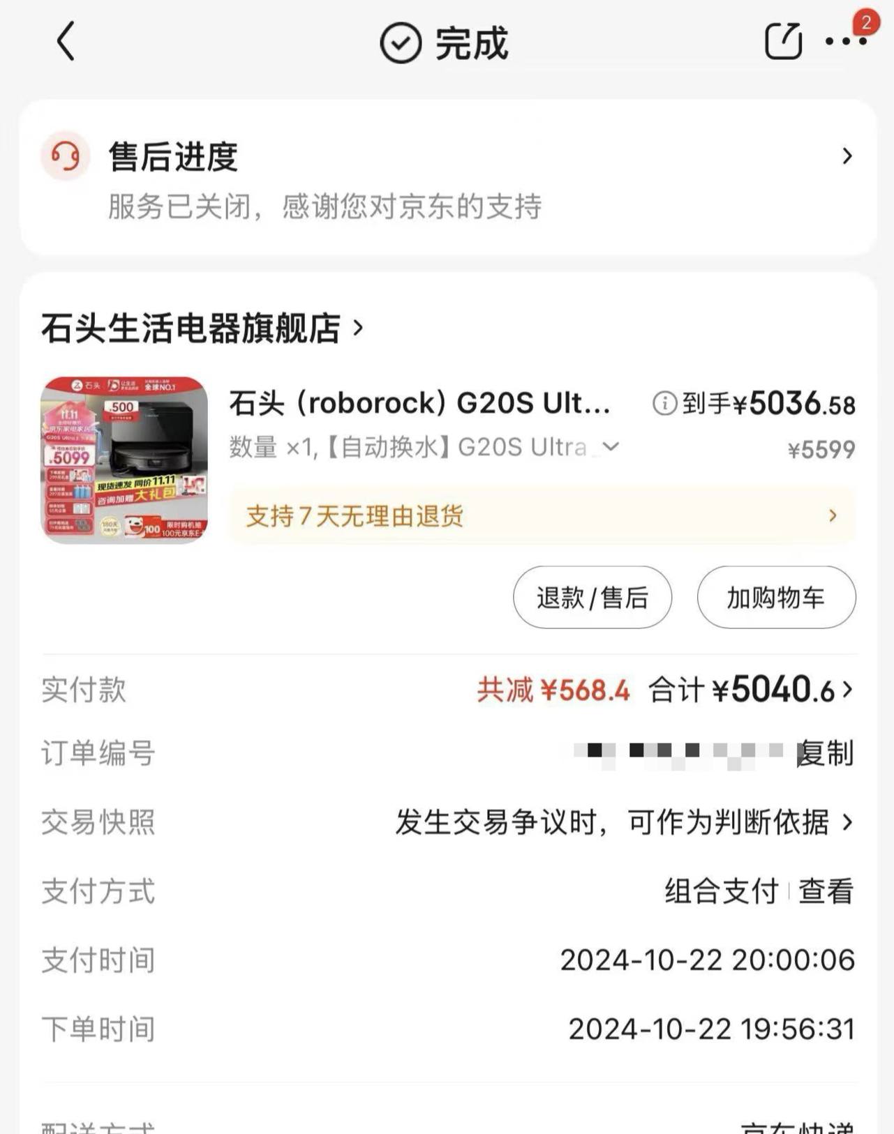据顾客张女士介绍,10月22日晚,她在“石头生活电器”网上旗舰店购买了一款扫地机器人,在使用会员折扣后,最终支付价格为5040.6元。扫地机器人将于25日到达。