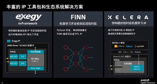Alveo UL3422 通过使用可用的基础设施生态系统解决方案和参考设计,加速卡通实现快速部署,从而为交易开发人员提供快速完成设计并投放市场所需的优势。这些解决方案由不断壮大的生态系统合作伙伴解决方案网络支持,提供这些解决方案 IP 为了实现交易解决方案的快速实施,开发框架。比如 Exegy 它是一家端到端前台交易解决方案提供商,可预建基础设施。 IP 能达到超低延迟,运行时堆栈和 API 还简化了开发。Hypertec 它是一家面向金融服务业的硬件、云和升值解决方案提供商,Xelera Technologies 它是一家面向高速网络技术和机器学习的公司( ML )使用的软件提供商, 与 AMD 在高频交易中,合作有助于应对机器学习算法的延迟缺陷。