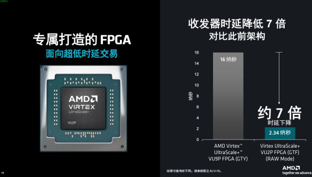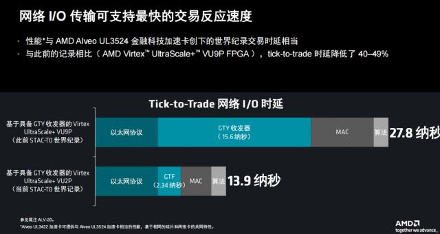 AMD 主要通过 GTF 为了达到极低的延迟目标,收发器。AMD 高级产品线主管自适应和嵌入式计算事业部 Shyam Chander 解析,GTF 和 GTY 这两种收发器的网络协议是一样的,但是 GTF 与以前相比,收发器 GTY 关于收发器性能的提高 7 倍,延迟从 16 纳秒降至仅限 2.34 纳秒,主要是完成最大硬化。而 tick-to-trade 这种延迟可以减少 40% 到 49%,相当于 14 纳秒(13.9 纳秒),尤其对金融业的交易而言,这是一个巨大的优势。
