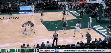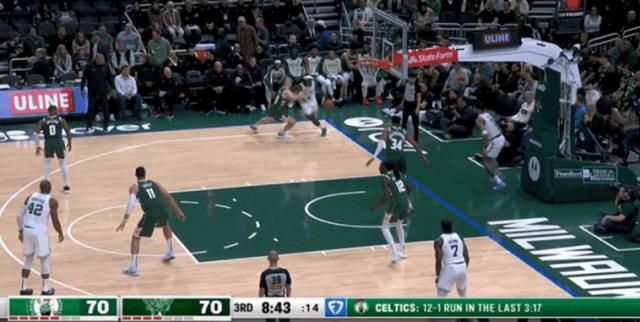 最后一节开始,字母哥补篮成功,霍福德上篮打进。 2 字母哥突破暴扣,凯塔补扣得分。康诺顿连得 5 分数,字母哥突破挑篮,凯塔空切暴扣,普里查德技术犯规罚球。杰伦是字母哥 - 前一种情况是布朗的恶意犯规。 2 罚全中。塔图姆连得 5 分反超雄鹿 4 分数,波蒂斯补篮成功,怀特三分命中,AJ- 格林和塔图姆对飙三分。字母哥突破成功,导致犯规投球加罚投球,霍乐迪 2 罚全中。雄鹿最终 36.3 秒仍然落后于凯尔特人 5 得分,普林斯三分不进球,塔图姆继续走上罚球线。 4 罚款全中锁定胜局。最终凯尔特人逆转获胜,赛季连杀雄鹿。