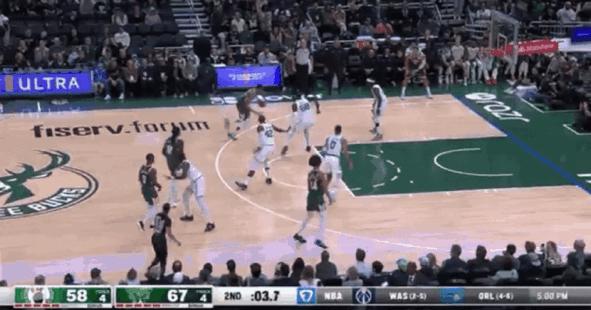 在两名防守球员面前,字母哥转身完成极限上篮。