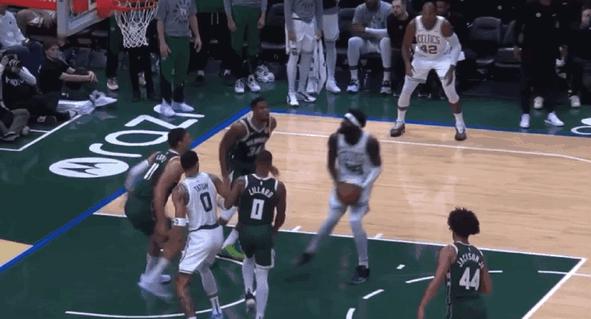 三分出手后,塔图姆被字母哥垫脚,他在扭伤脚踝后仍然带伤坚持出战。