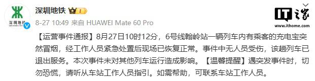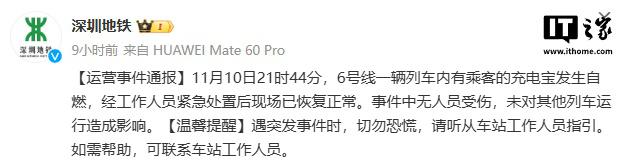 IT 世家 11 月 11 每日消息,深圳地铁通报,11 月 10 日 21 时 44 分,6 一辆列车上有乘客的充电宝自燃,经过工作人员紧急处理后,现场已经恢复正常。事件中没有人员受伤,也没有影响其他乘客列车。。