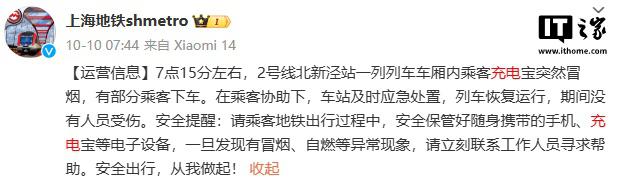 10 月 10 日 7 点 15 分大约,上海地铁 2 号线北新泾站列车车厢乘客充电宝突然起烟,部分乘客下车。在乘客的帮助下,车站得到了及时的应急管理,列车恢复运行,期间没有人受伤。