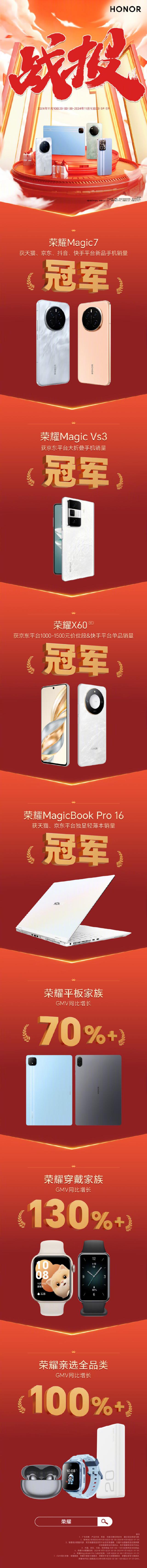 同时,荣耀 Magic Vs3 获得京东平台大折叠手机销售冠军;荣耀 X60 那是在京东平台上 1000-1500 元价位段和快手平台单品销售中技压群雄;荣耀 MagicBook Pro 16 更加成为天猫、JD.COM平台独显轻薄本销量的佼佼者。另外,荣耀平板家族 GMV 高达同比增长 70%的荣耀穿戴家族 GMV 也实现了 130% 增长,荣耀亲选全品类 GMV 同比增长了 100%。