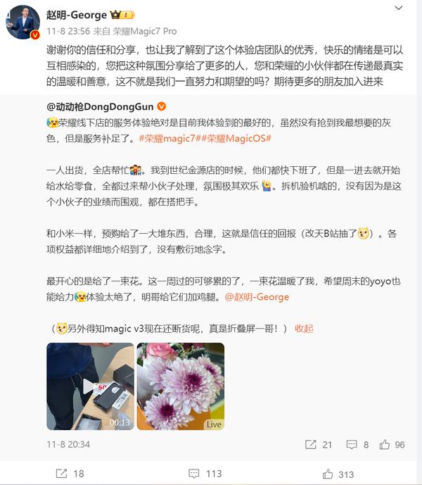 用户反馈,荣耀 CEO 赵明回答说:“谢谢你的信任和分享,这也让我明白了这个体验店团队的优秀,幸福的心情可以相互感染。你和更多的人分享这种氛围,你和你光荣的朋友传递着最真实的温暖和善意。这不就是我们一直在努力和期待的吗?”