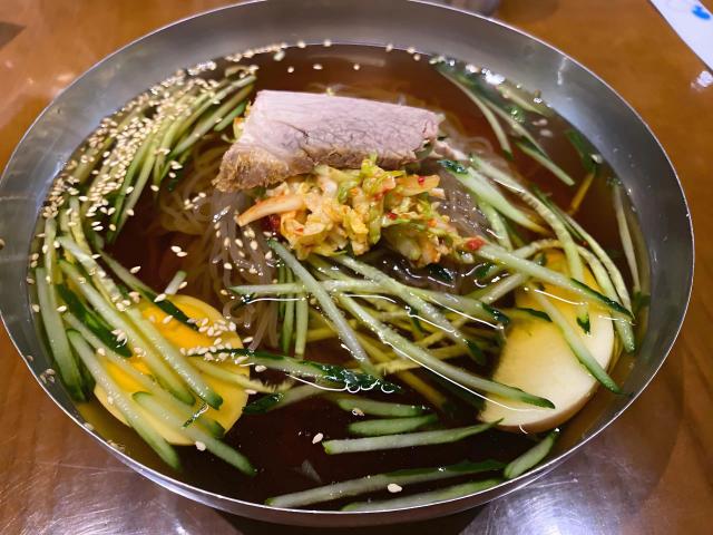 炖牛肉汤泡菜汤,加入一些白糖和白醋,冷冻得正好有冰碴。嗯,面条一定要荞麦面,很滑。最后,吃一些牛肉片、朝鲜辣酱和黄瓜丝。别忘了切几块。 " 国光 " 苹果。嘿,酸甜可口的味道, " 过山车在舌尖上 " 啊!