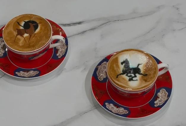 文创咖,新疆博物馆,在咖啡上打印博物馆logo。我们博物馆二楼的咖啡馆,它的咖啡拉花都是经典的国宝图案,最近推出的彩色凤冠拉花受到了广泛的青睐。