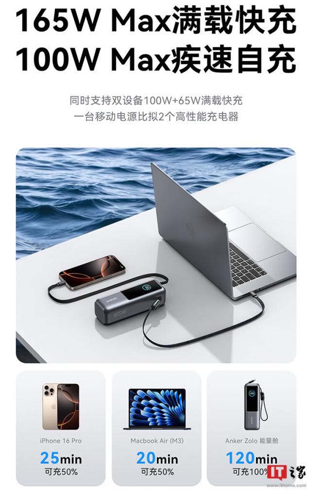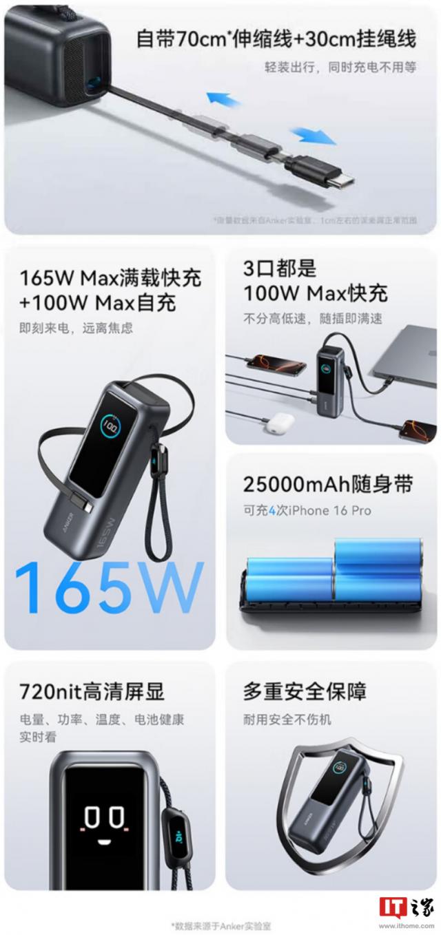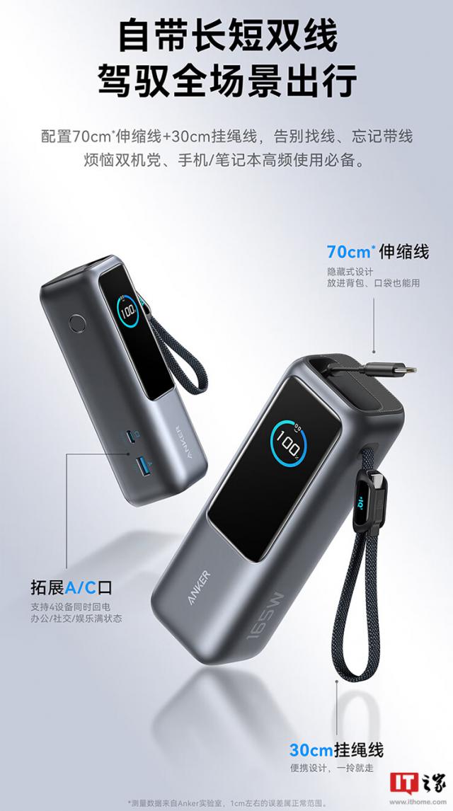 安克,据报道 Zolo 能源舱移动电源配置 720nit 屏显支持实时检查电量、功率、温度、电池健康; 70cm 伸缩线 30cm 挂绳线,支持 165W Max 满载快充 100W Max 自充。