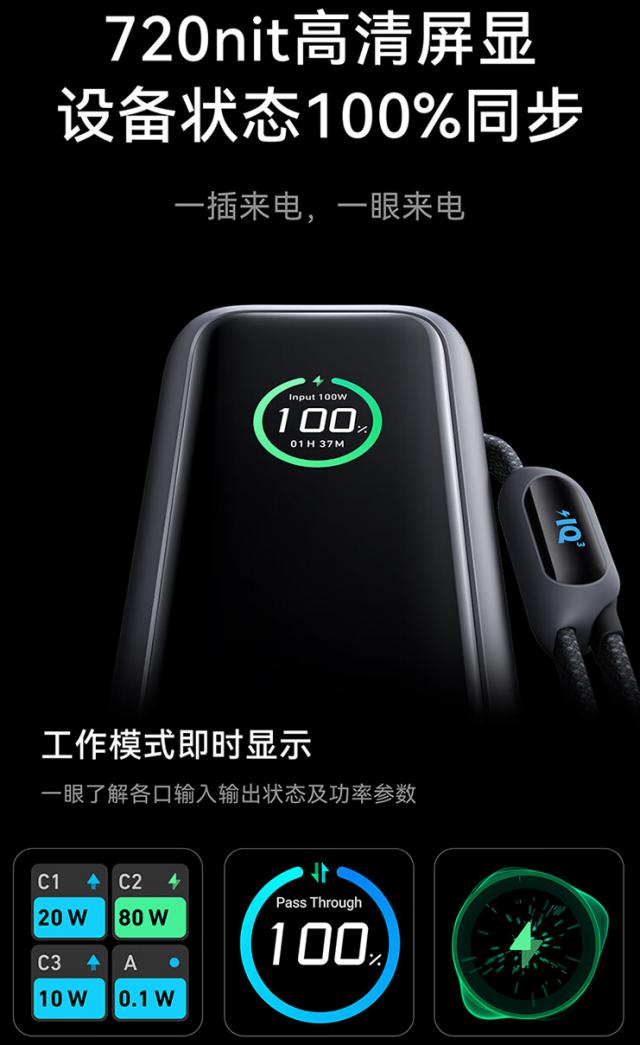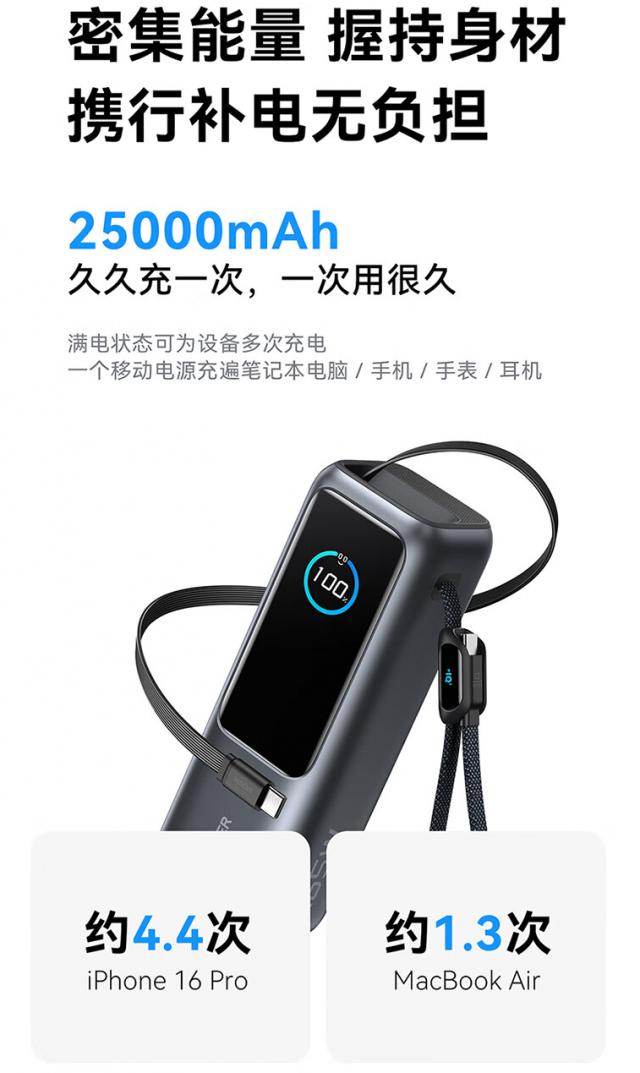 这个移动电源的容量是 25000mAh,声称可充 4.4 次 iPhone 16 Pro;支持移动电源 4 台式设备同时回电、3 口 100W Max 快速充电(这里估计是指 3 一个充电口可以支持 100W 功率快充),可以做双设备提供 100W 65W 满载快充。