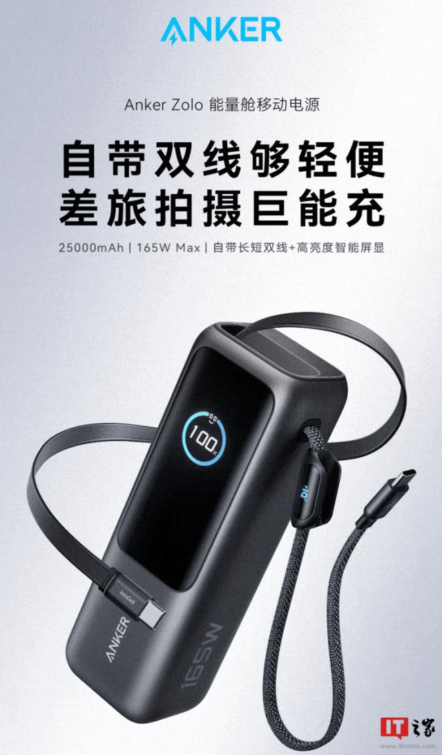 IT 世家 11 月 11 日消息,安克 Zolo 能源舱移动电源现在正式发售,这种移动电源采用自带线设计,容量为 25000mAh,首发价 499 元。