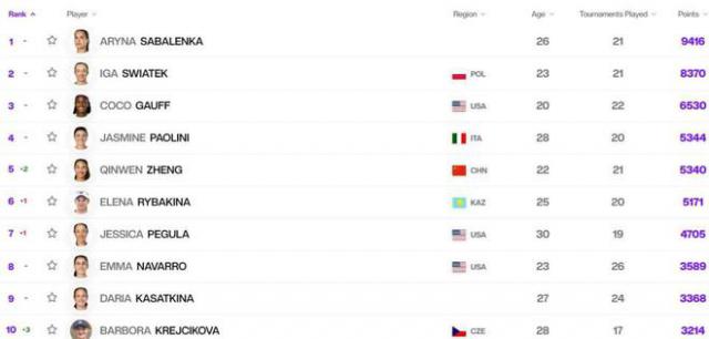 提高郑钦文的排名 2 个人排名,莱巴金娜和佩古拉两人相应减少。 1 每个人都排在第一位 6 和第 7 名字。克雷吉茨科娃在总决赛中闯入半决赛,从第一名开始 13 名上升 3 来到第一个位置 10 名,以 TOP10 身份结束了 2024 这个赛季的旅程。