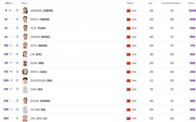 除郑钦文外, 3 中国选手的位置 TOP100 这个赛季的身份结束了。王欣瑜 1418 分排名第 37 位,袁悦 1162 分排名第 47 位,王雅繁 994 分排名第 61 位。在赛季的最后一刻,王曦雨跌出。 第一,TOP100 102 名字的身份结束了这个赛季。此外 TOP200 选手还包括朱琳(122)、韦思佳(131)、172(172)。