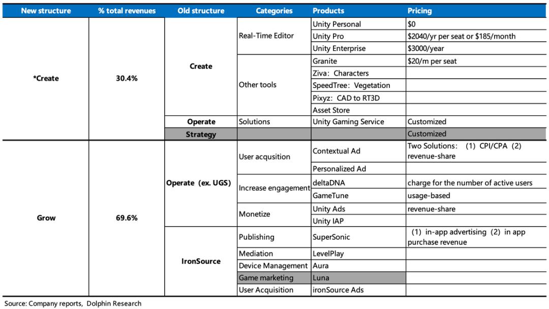 2023年第一季度,Unity并入了IronSource业务,同时也调整了细分业务的划分范围。在新的披露结构下,分支业务由原来的三个组成(Create、Operate、策略)浓缩成2个(Create、Grow)。