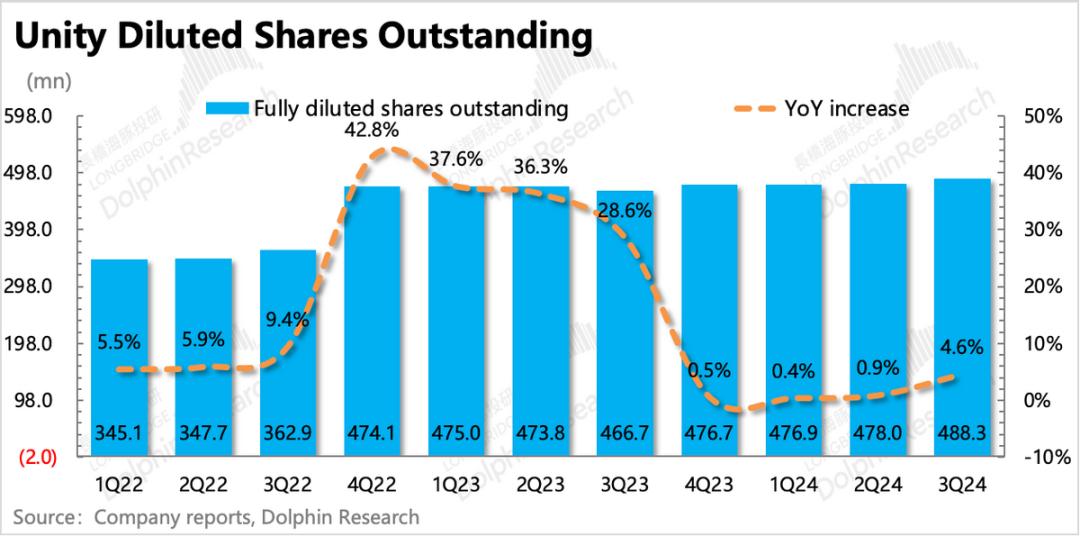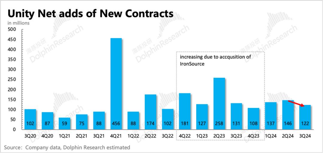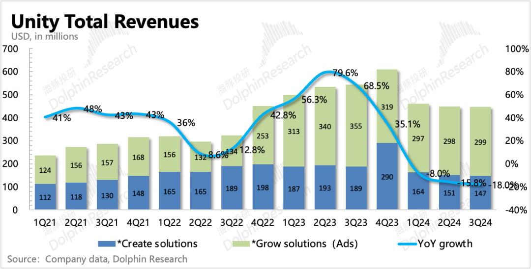 美东时间11月7日美股交易结束后,游戏引擎龙头Unity发布了2024年第三季度业绩。虽然Runtime收费在9月份被宣布取消,股价迅速上涨了近30%,但海豚君始终认为,支持估值坚实回归的核心关键是Grow业务什么时候会因为更伤逻辑的竞争问题而从趴地到起床。
