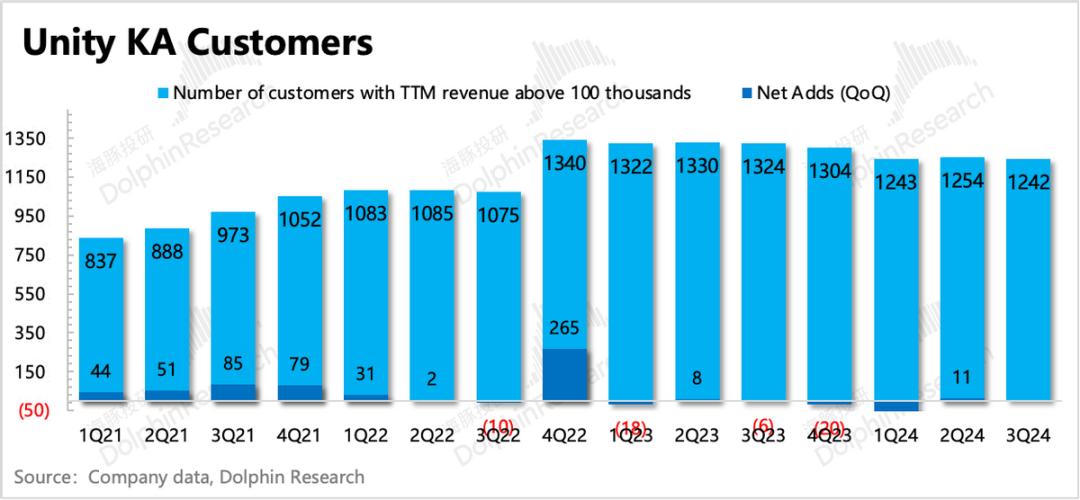 大客户数量一般是发动机业务的用户(至少签一年),所以过去一年客户数量的变化主要受业务重组的影响。例如,原来的Weta、在公司关闭业务后,一些专业服务或Luna的客户也流失了。此外,客户在Unity上“降级消费”,年支付降至不到10万美元。