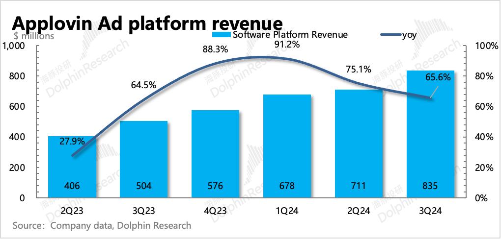但是竞争的问题似乎仍然没有解决。Unity的头号竞争——Applovin,今年Unity萎靡不振,势头汹汹,丝毫没有减弱。第三季度提供广告撮合服务的软件平台收入同比增长66%,是近两年Applovin业绩暴涨的主要贡献来源。而且两年前,Applovin还试图收购Unity来扩大自己的移动营销版图,并补充自己与上游游戏开发商的业务链。