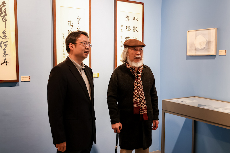 在展览现场,谢春彦(右)和中国现代新闻出版博物馆馆长赵书雷(左)