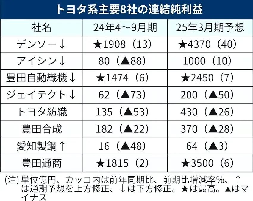 丰田是8家头部零部件分公司,近日公布了2024年4月至9月的合并财务报表。由于中国地区生产不景气,大多数零部件公司的利润都被降低了。
