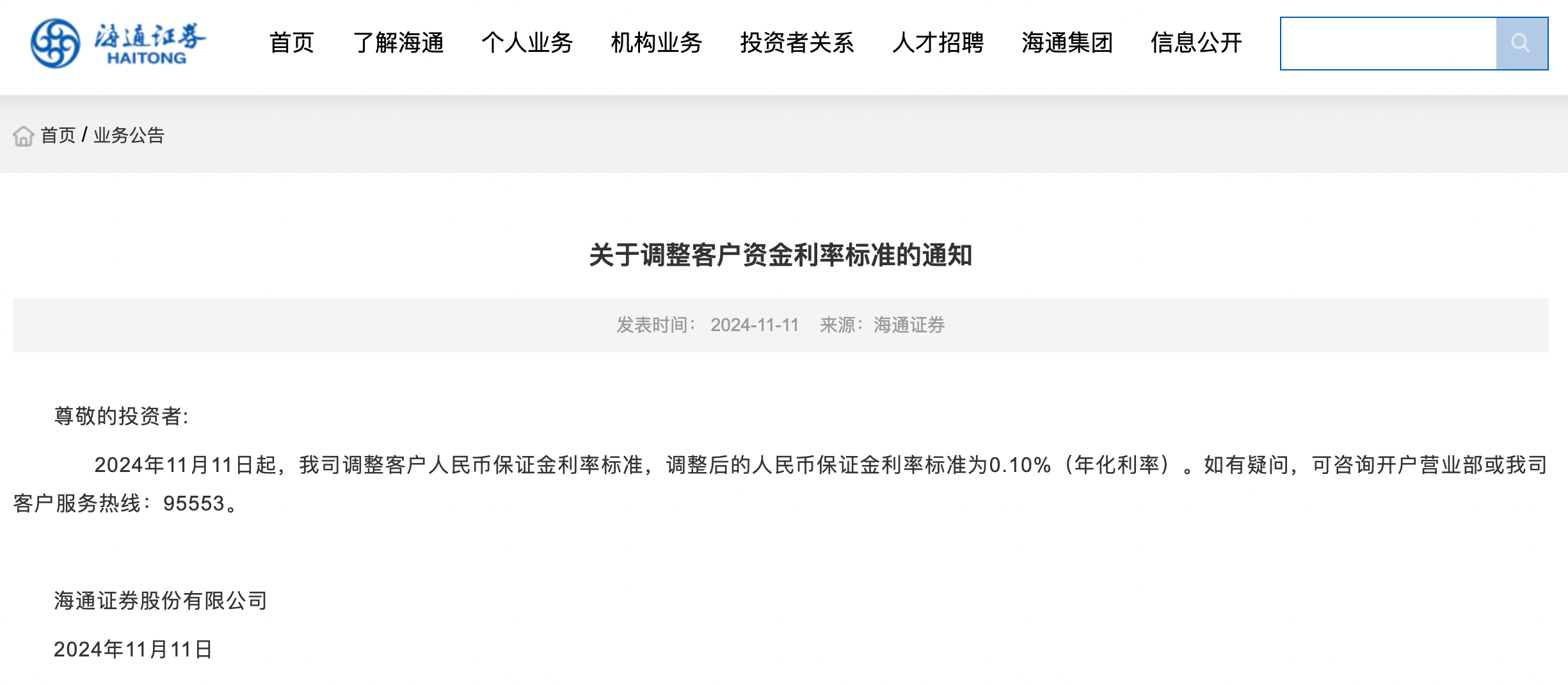 海通证券、国泰君安于11月11日发布通知称,公司从11月11日起调整客户人民币保证金利率标准,调整后的人民币保证金利率标准为0.10%(年化率)。