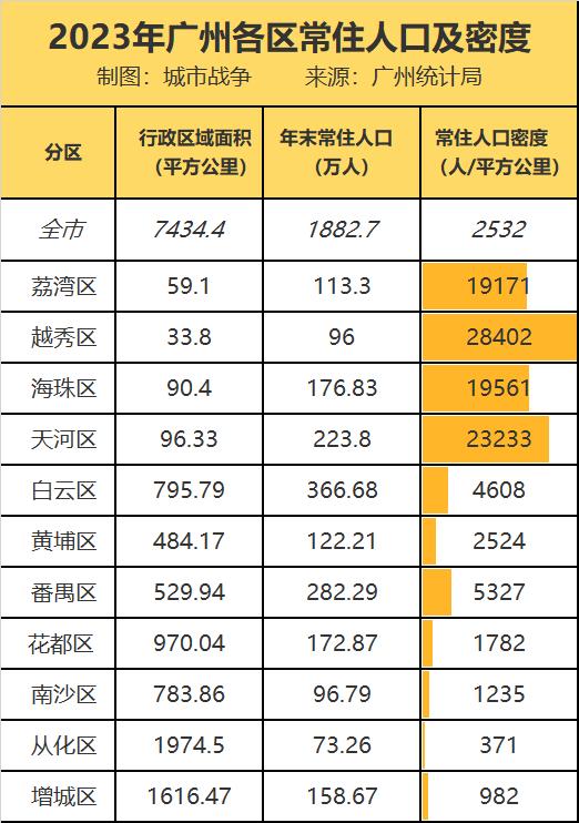 越秀区居住人口密度位居全市第一,达2.84万人/平方公里;天河第二,达2.32万人/平方公里;海珠第三,1.96万人/平方公里;荔湾第四,1.92万人/平方公里。