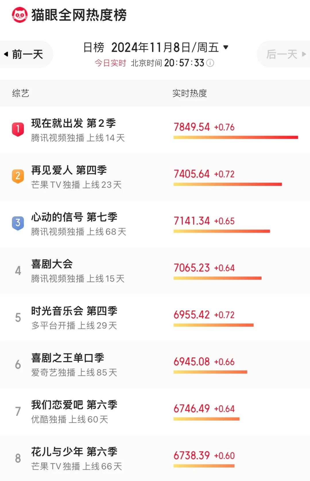 据猫眼专业版数据显示,情感综艺在全网十大热门榜单中占有三席,而《再见爱人4》和《心跳信号7》则连续多日位居前三,已超越传统综艺市场的热门音综、旅综、喜综。聚焦男女关系的情感综艺节目正在悄然超越,以更具爆点的内容逐渐成为综艺市场的新顶流。。