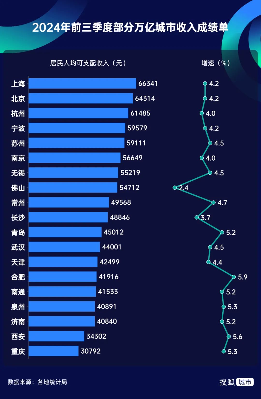 比如宁波、苏州、南京、无锡、佛山,全国顶级人均收入城市——上海、北京、杭州,前三季度居民人均可支配收入增速低于全国(5.2%),佛山甚至只增长了2.4%。在这些城市中,只有苏州和无锡的消费增长率超过了市场。