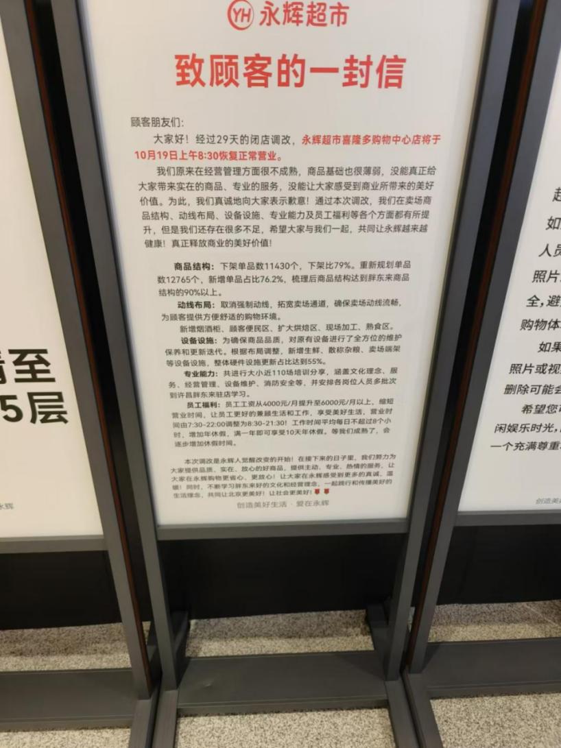 笔者在门口的告示牌上看到,这一次爆改,永辉下架单品数11430个,下架比79%。重新规划单品数12765个,新增单品占比76.2%,梳理后商品结构达到胖东来商品结构的90%以上,另外还给员工提高福利待遇,从4千月薪涨到6千、缩短营业时间等。