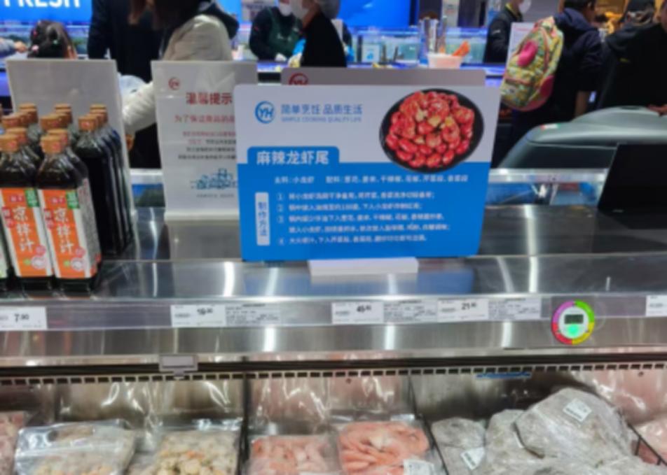 我看到熟食区的每款产品前,都贴有配料表,不少食材背后也有相关的常见做法和厨房小知识,如做麻辣龙虾尾、小米熬制的步骤,海鲜区内,每种海鲜都会贴心标出螃蟹如何辨别公母等;一些冷藏柜还挂出保温手套供顾客使用。
