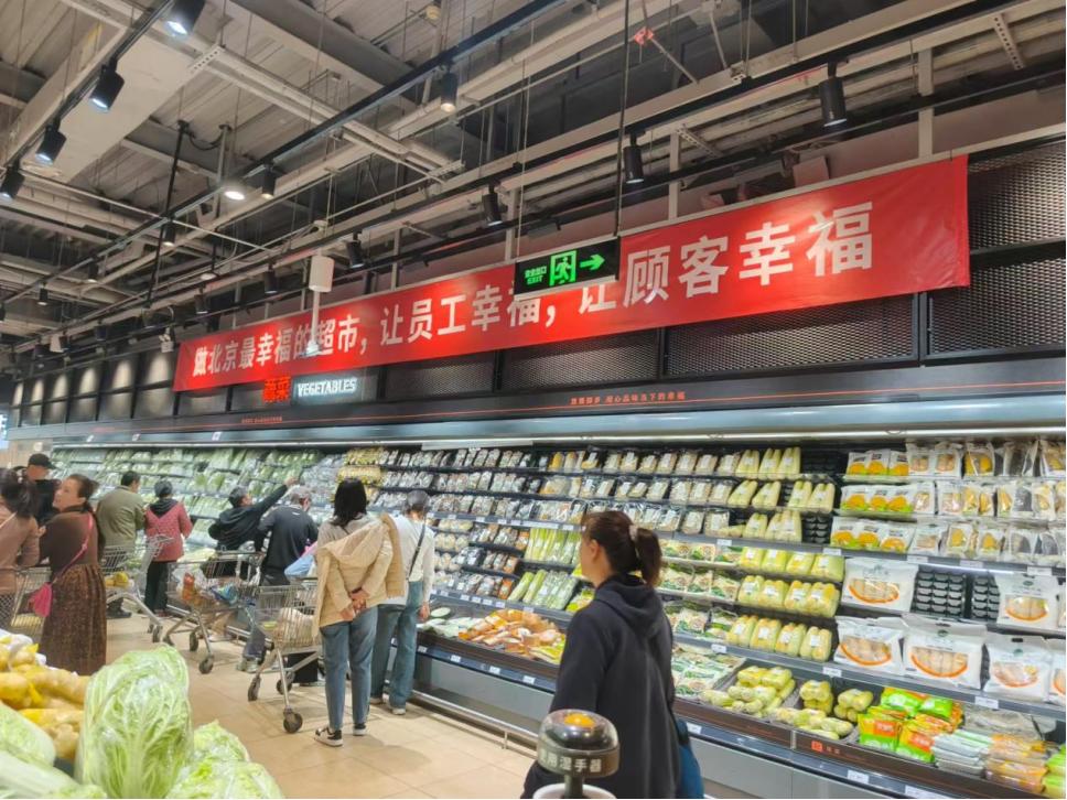在近期某个工作日下午,笔者实探永辉超市北京喜隆多店,当天下午三点多,门店人气不错,一改往日冷清气氛,不少人围在熟食区排队买单,乍一看也很有胖东来的风格。